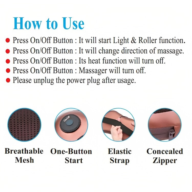 - Mini Massage Cushion comes with the adaptor plug and a car charging socket so you can use it in your home or in the car.Â